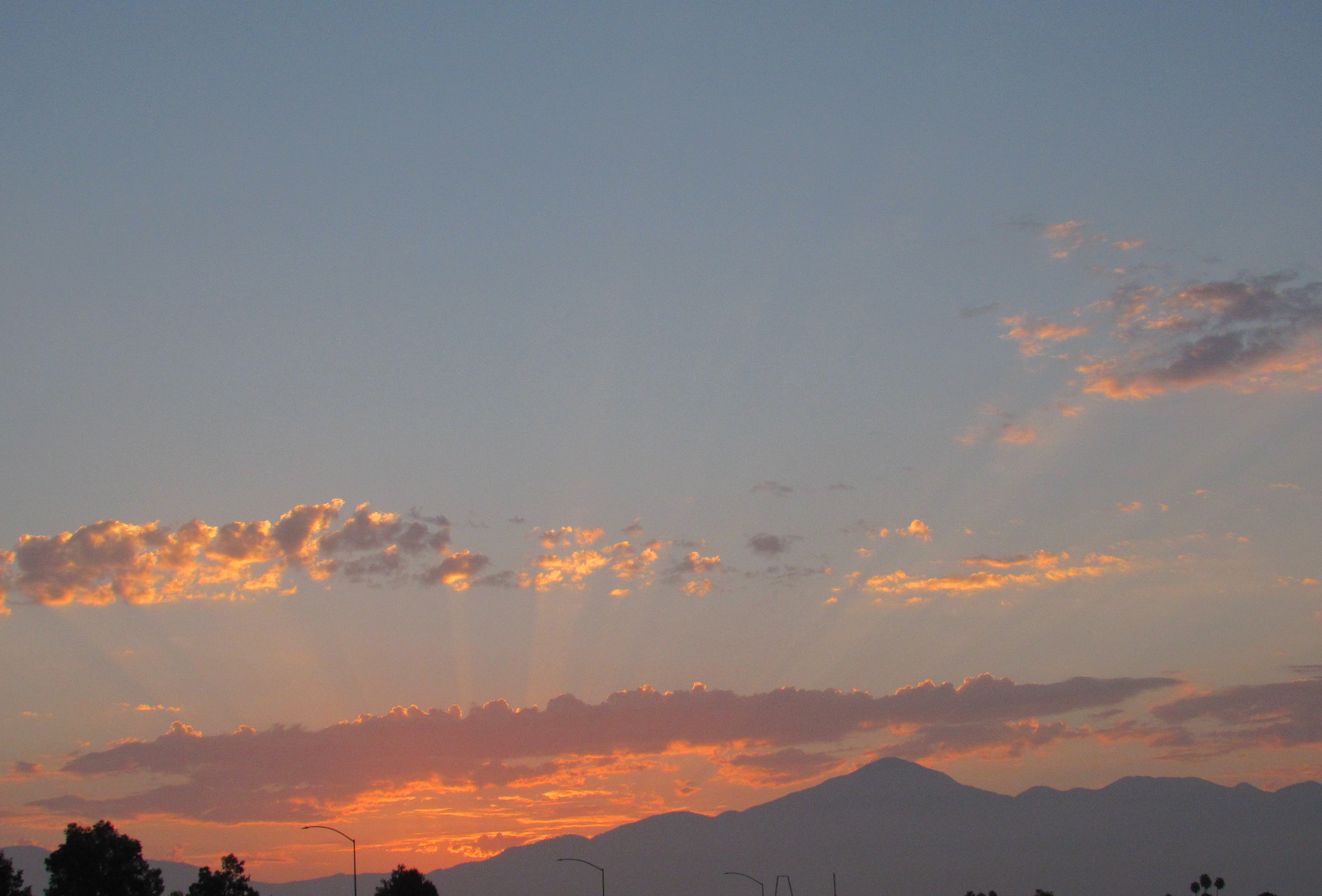 The sun rays are visible across the eastern sky above the San Bernardino Mountains.