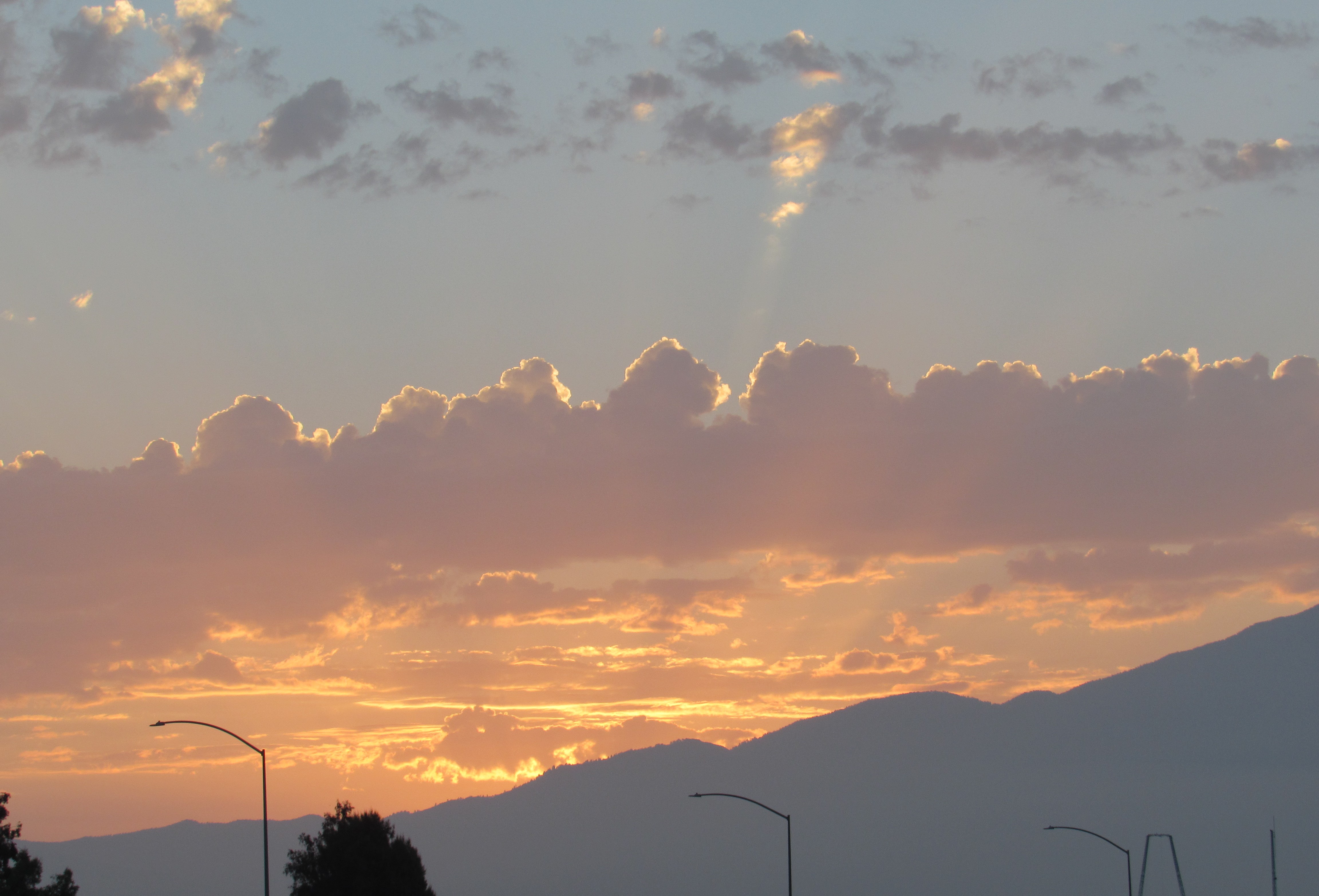 One sun ray illuminates a small cloud above a larger cloud cluster.